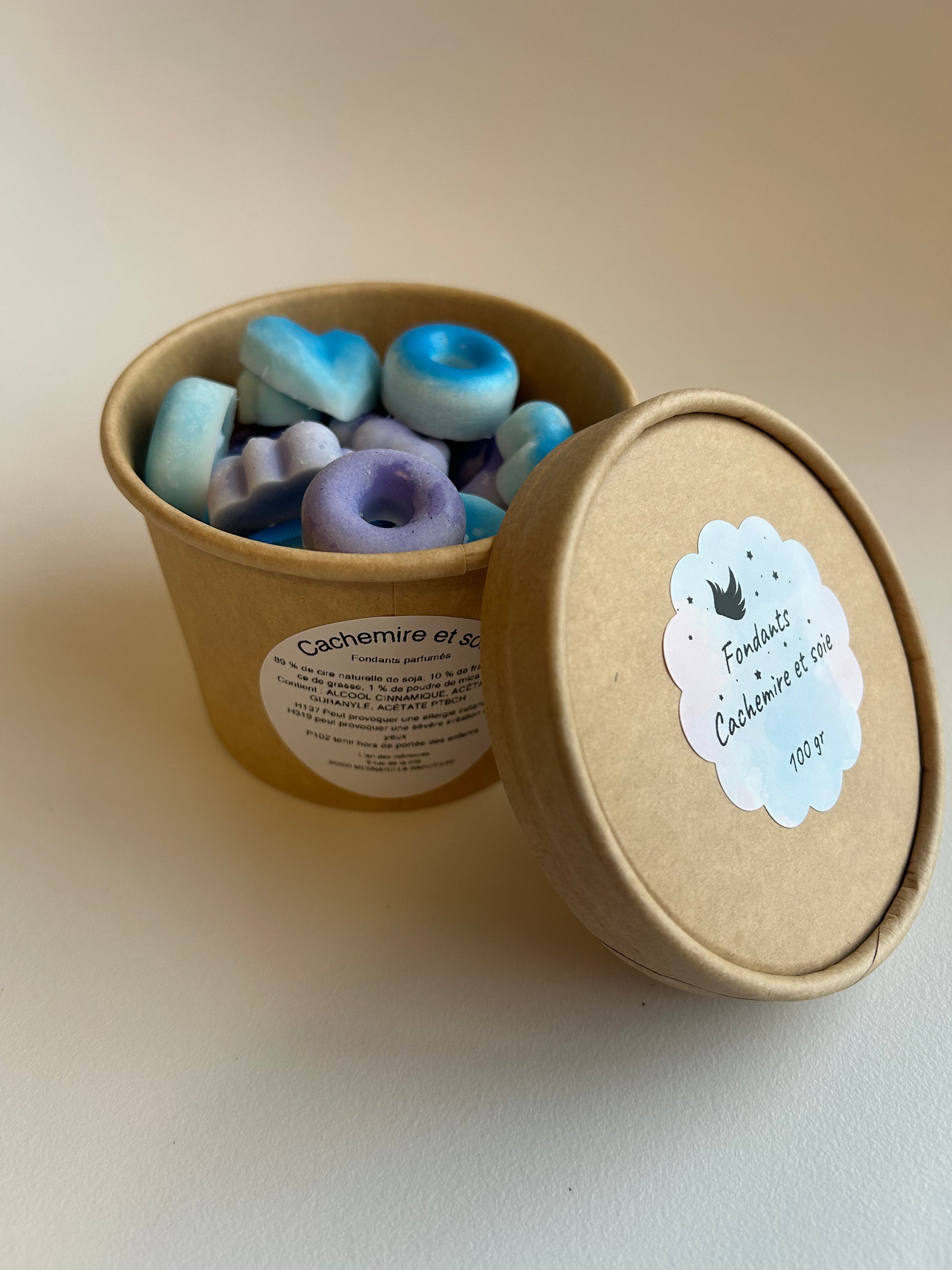 Boite en carton avec couvert, contenant des fondants parfumés de taille différentes 100g