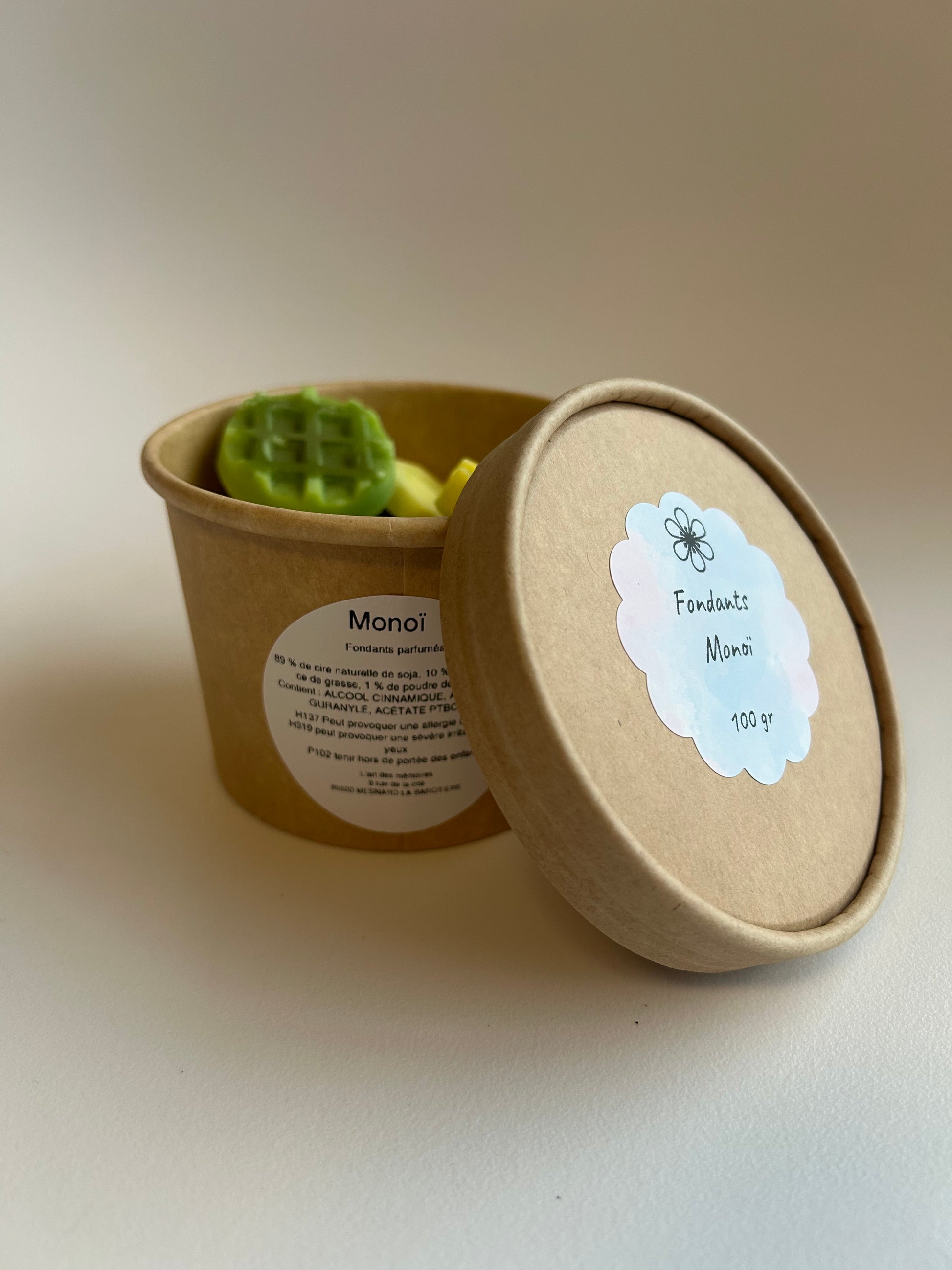 Boite en carton avec couvert, contenant des fondants parfumés de taille différentes 100g